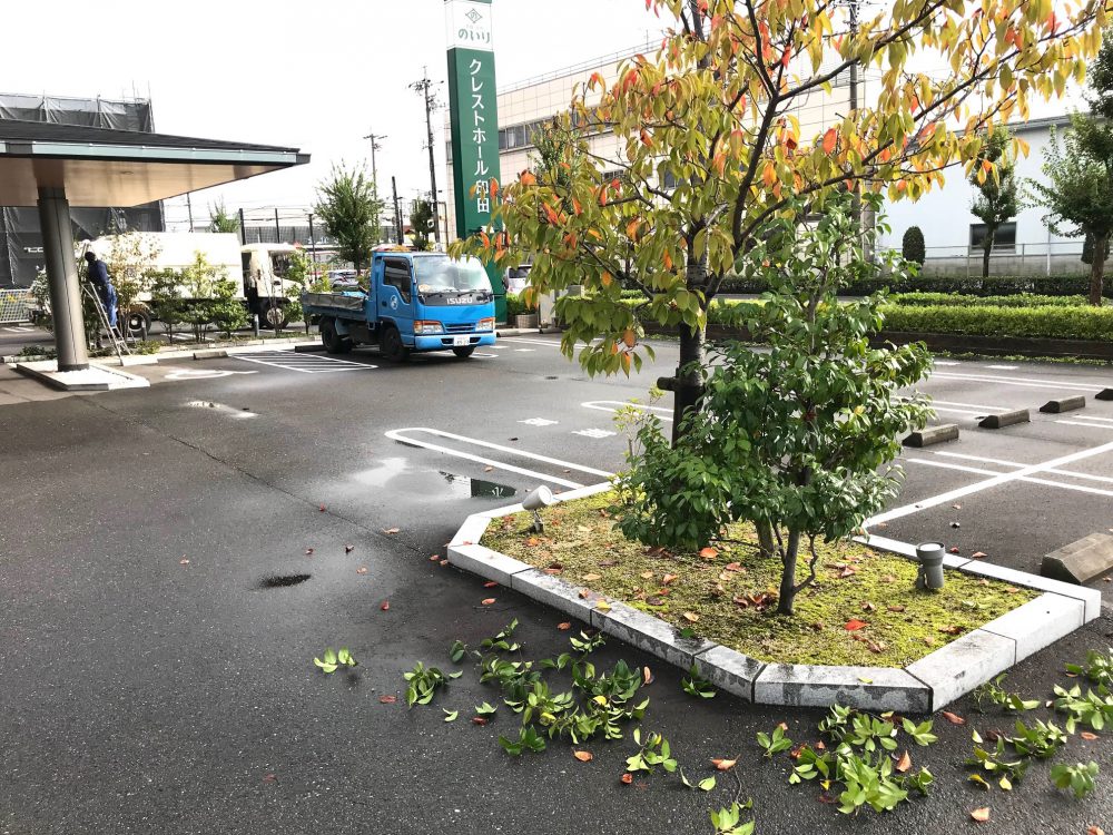 株式会社のいり様の葬儀場の一つであります一宮市白旗通地内にあるクレストホール印田の樹木剪定及び施肥工を行いました。こちらのホールの樹木植栽は、弊社が10年程前に植栽工事をさせていただいて以来、ずっと樹木管理をさせていただいております。道路沿いに植えられているボックスウッド(低木)を刈り込む以外は、すべて枝を抜いて透かし剪定をしています。そうすることで奥行きを出し、透け感が出て自然風の仕上がりにしています。特にホール内からみえる中庭は弊社としても自慢の庭の一つであります。