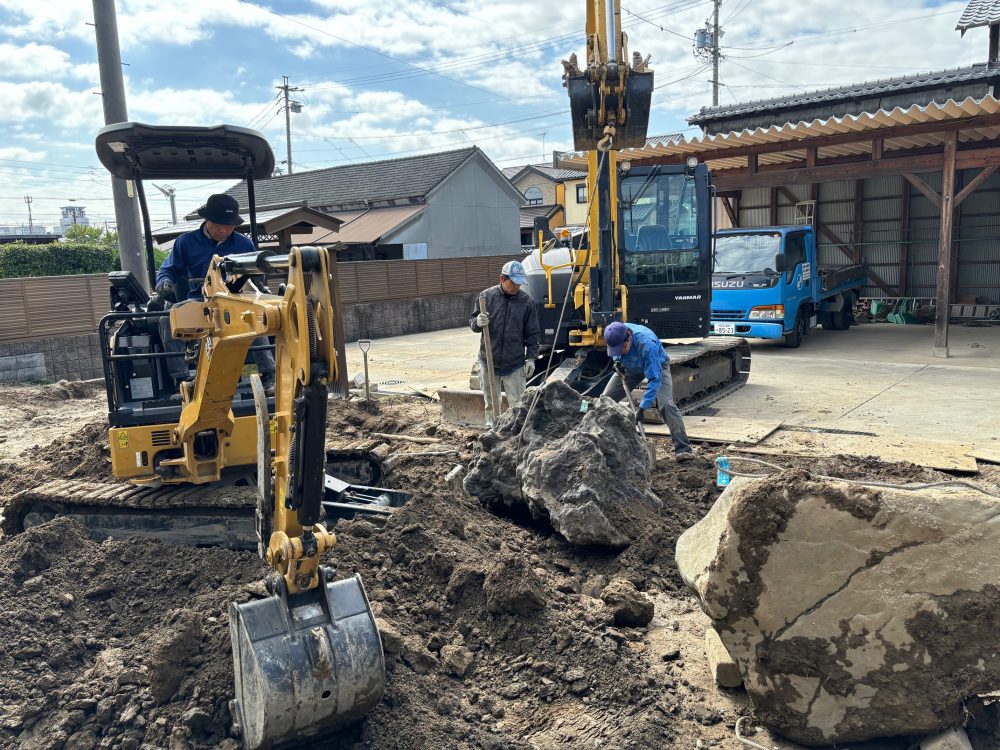 まずは、樹木伐採と抜根、残す樹木の根巻(仮移植)、その後、0.25バックホウにて庭石の撤去、積込、処分を行いました。順調にすすみ、約5日間ほどで既存の庭を更地にすることができました。大きな景石3石は吊り上げることができなかったので、ノミ付きバックホウにて割って処分することにしました。