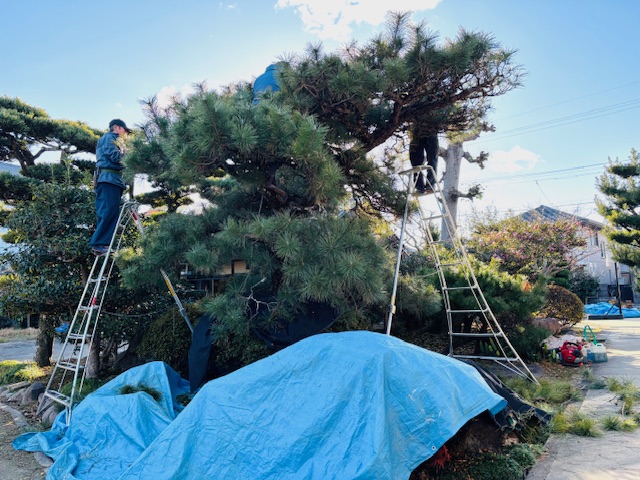 本日は例年8~9人工かかっているお客様です。残念ながらクロマツが数本枯れてしまったために根元から伐採しましたが、その他、クロマツやマキなどは剪定を行っていきます。
